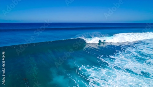 © Payoner, Fototapeta premium Azure ocean wave breaks over vibrant turquoise shallows under a clear blue sky