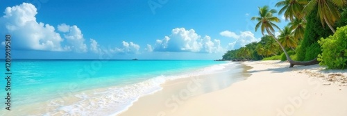 Fototapeta premium Azure sky over pristine sandy beach, turquoise waves , outdoor, beach