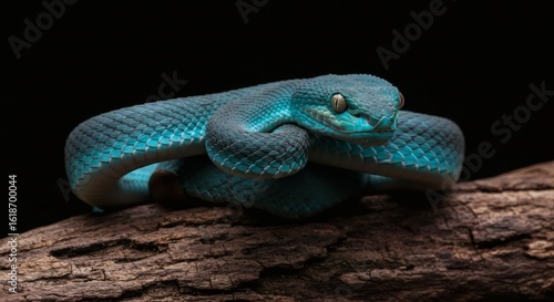 © Nusa Penida Co, Fototapeta premium Azure Viper: A striking image of an iridescent azure viper coiled gracefully on a weathered branch, showcasing the captivating beauty and intricate textures of the serpent in its natural environment.