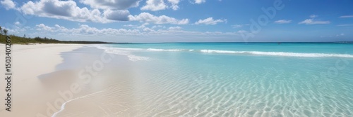 Obraz premium Azure water laps white sand beach, bright blue sky overhead , Mediterranean...