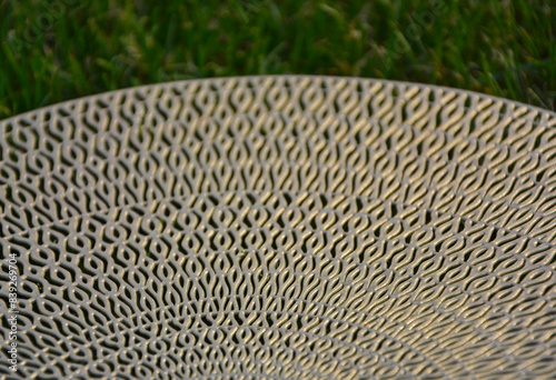 Fototapeta premium ażurowy wzór, złota podkładka na stół na tle trawnika, wzór mandala, gold table mat, mandala pattern, Decorative Doily, Gold table mat surface as background, closeup