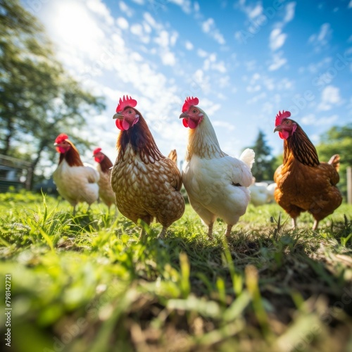 © duyina1990, Fototapeta premium b'A group of free range chickens on a grassy field looking at the camera'