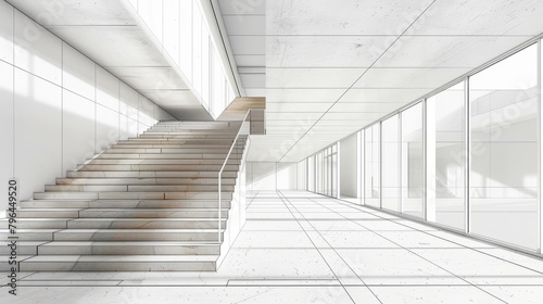 Obraz premium b'Architectural sketch of a modern building interior with stairs and large windows'