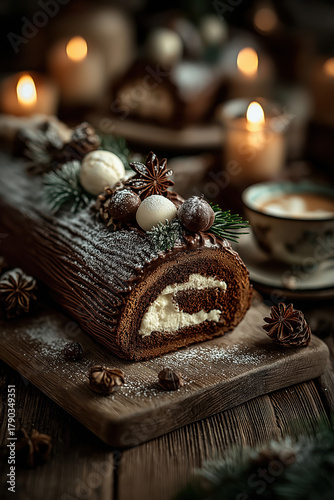 © JulieMeneghin, Naklejka premium Bûche de Noël au chocolat décorée de crème et de fruits confits, dessert festif et gourmand sur une table illuminée, ambiance chaleureuse de fête