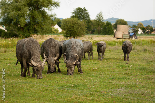 Fototapeta premium Büffelherde bei der Nahrungsaufnahme