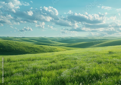 Fototapeta premium b'Green rolling hills under blue sky with white clouds'