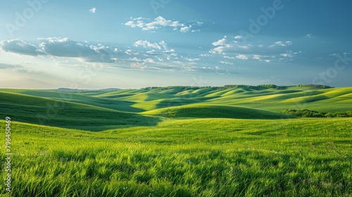 Fototapeta premium b'Green rolling hills under blue sky with white clouds'