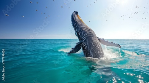 Obraz premium b'Humpback whale breaching the ocean surface with seabirds flying overhead'