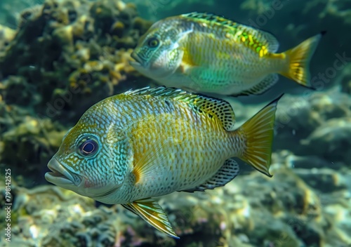 Fototapeta premium b'Two yellow and green fish are swimming near a coral reef'