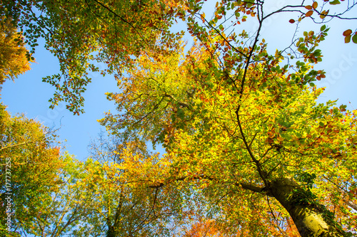 Fototapeta premium Bäume mit bunten Blättern, Froschperspektive, blauer Himmel