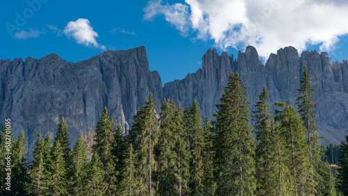 Fototapeta premium Bäume vor dem Latermar-Bergen in den Dolomiten (Italien)