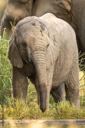 © Nick Dale, Naklejka premium Baby African bush elephant drinking at waterhole