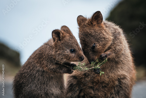 © Sappheiros, Fototapeta premium Baby and mother quokka eating green twigs. Close up of cute quokkas on Rottnest Island, Western Australia