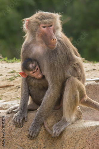 © The Speedy Butterfly, Fototapeta premium Baby baboon clinging to mom
