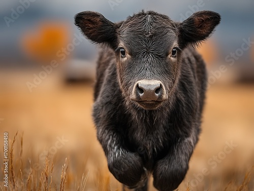 © le, Fototapeta premium Baby Black Angus calf running across grassland, dynamic motion capture, wildlife style