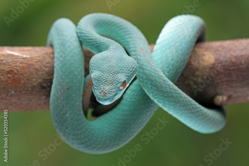 Obraz premium Baby blue viper snake closeup on branch,blue insularis,Trimeresurus Insularis
