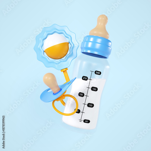 Fototapeta premium Baby bottle and pacifier with beanbag toy