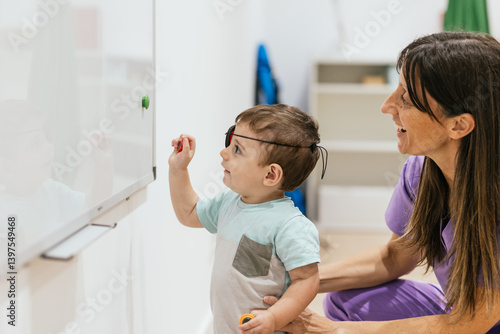 © Jordi Mora, Fototapeta premium Baby boy wearing eye patch playing during eye exam with doctor