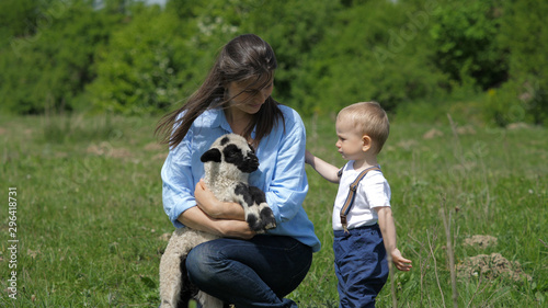 Fototapeta premium Baby child and mother portrait, parent holding little lamb, learn to love animal