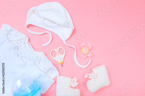 Obraz premium Baby concept. Baby cloth and goods on pastel pink background. Place for text. View from above. Flat Lay- Image