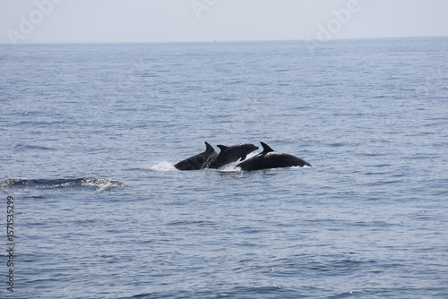 Fototapeta premium Baby Dolphin Leaping Between Two Adults in the Open Ocean, Indian Ocean