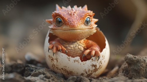 Obraz premium Baby dragon hatching from a cracked egg, close-up, curious eyes, detailed scale