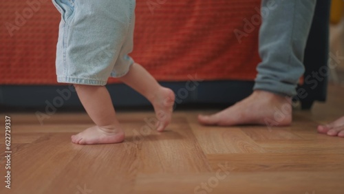 Fototapeta premium baby first steps. daddy a teaches baby toddler son to take first steps. happy family kid dream concept. baby indoors learning to walk father holding child hands. lifestyle fathers day concept
