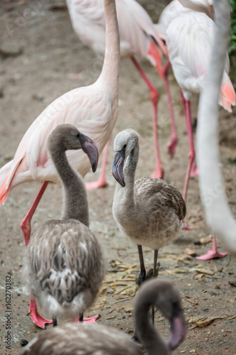 Obraz premium Baby flamingo standing in the midst of its flock.