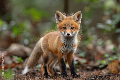 Naklejka premium Baby Fox: An adorable baby fox kit with reddish fur and a bushy tail, exploring a forest clearing.