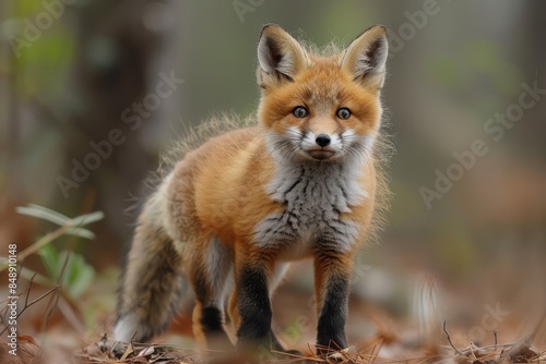 Naklejka premium Baby Fox: An adorable baby fox kit with reddish fur and a bushy tail, exploring a forest clearing.