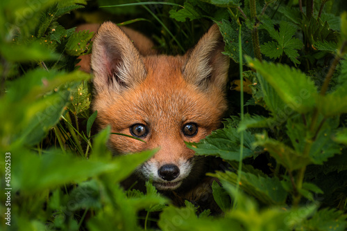© petertakacs, Fototapeta premium Baby fox hides inside the dense nettle