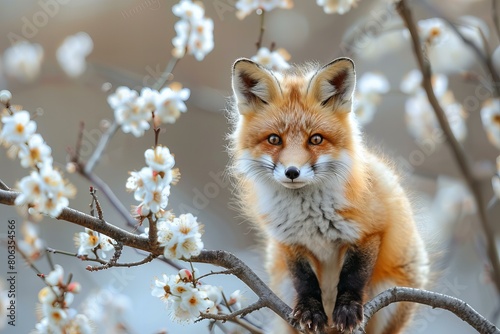 © Sandu, Fototapeta premium Baby Fox Perched Amid Blossoming Spring Tree Branches