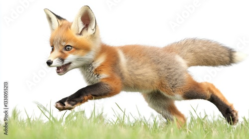 © nikomsolftwaer, Fototapeta premium Baby fox running through grass meadow gigapixel image natural environment close-up wild animal adventure