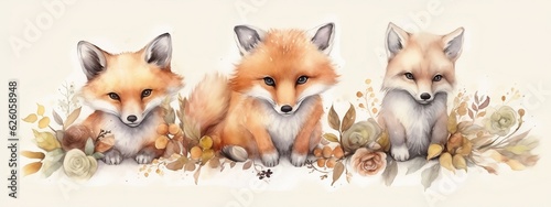 Fototapeta premium Baby foxes watercolor illustration. Generative AI