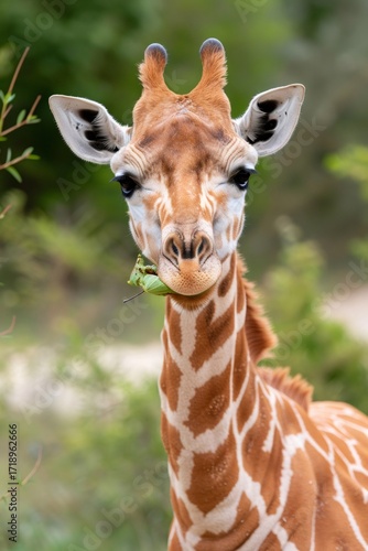 Fototapeta premium Baby giraffe eating leaf in nature close-up