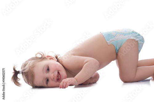 © serhiibobyk, Obraz premium Baby girl wearing a diaper isolated on white
