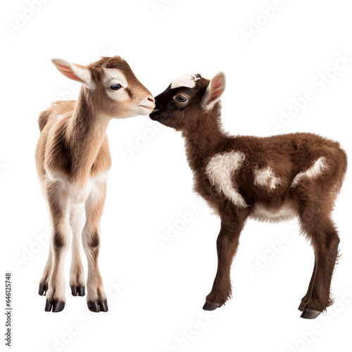 Obraz premium Baby goat and a lamb playing together, isolated on white background