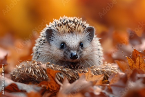 Fototapeta premium Baby Hedgehog: A tiny baby hedgehog with soft quills, curled up into a ball on a bed of fallen leaves.