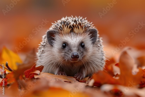 Fototapeta premium Baby Hedgehog: A tiny baby hedgehog with soft quills, curled up into a ball on a bed of fallen leaves.