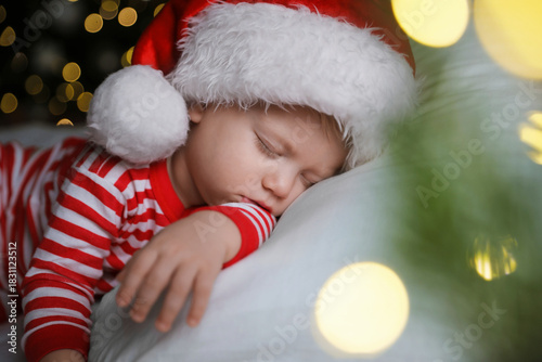 Fototapeta premium Baby in Christmas pajamas and Santa hat sleeping on bed indoors
