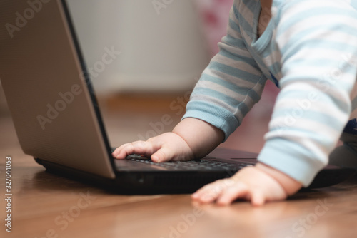 © Natali, Fototapeta premium Baby is studying a laptop on the floor close up.