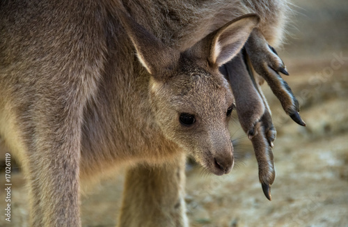 Naklejka premium Baby joey being carried in the pouch of female kangaroo