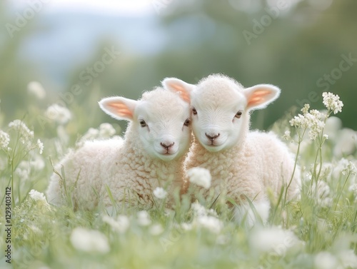 © Fokasu Art, Fototapeta premium Baby lambs are playing happily in a lush, rain-soaked field.