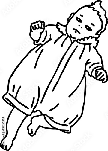 © Berolina, Fototapeta premium Baby laying, moving arms and legs. Nice dressed little child. New family member. Hand drawn illustration for event celebration design, postcard, invitation or poster. Cartoon character vector drawing.