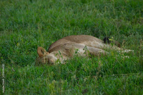 © PandaFrog, Fototapeta premium baby lion posing on the ground in the savanna uganda