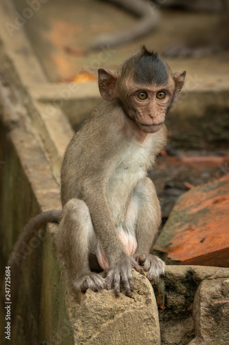 Fototapeta premium Baby long-tailed macaque sitting on wall corner