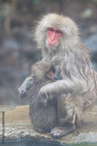 © Catalin, Fototapeta premium Baby macaque hugging his mother while breast feeding