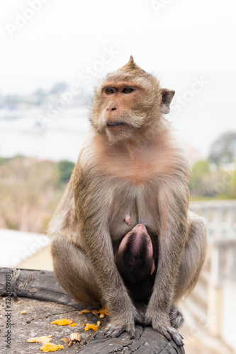 © amstockphoto, Naklejka premium Baby monkey nursing from mother at Khao sam muk in Chonburi Province, Thailand.