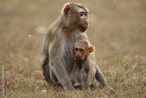 Fototapeta premium Baby monkey with his caring mother