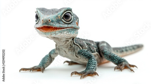 © Sasha Cine, Obraz premium baby Mosasaurus showcases its tiny sharp teeth as it gently opens its tiny jaws. smooth scaly skin features brilliant blue and gray shades highlighting its unique texture.